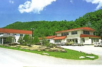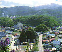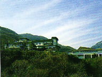 市街地を流れる武利川上流の沢沿い、小高い山を背景に立つ、山間の湯の宿。